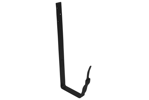 Облегчает монтаж водосточной системы за счет расположения фиксатора с внешней стороны крюка, что позволяет устанавливать желоб и после монтажа кровельного материала.